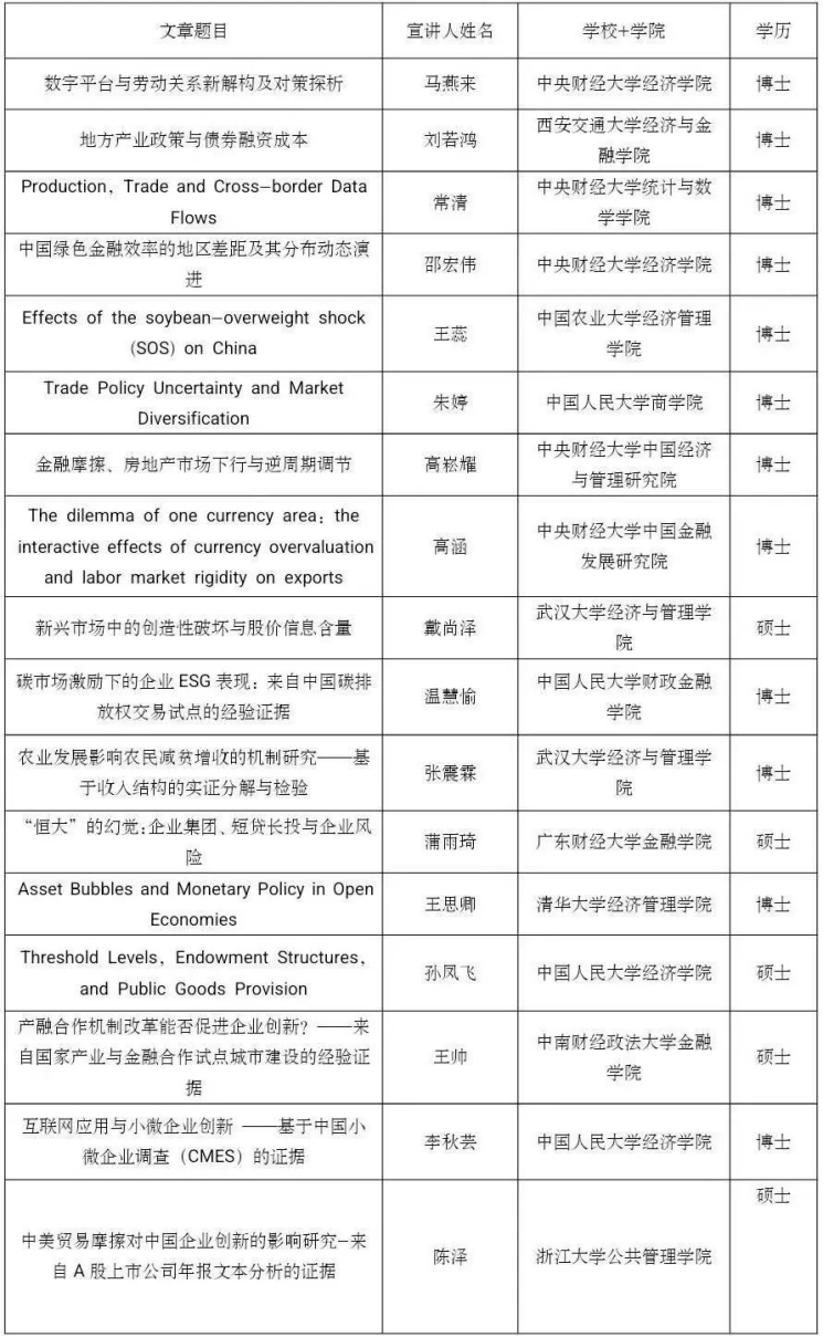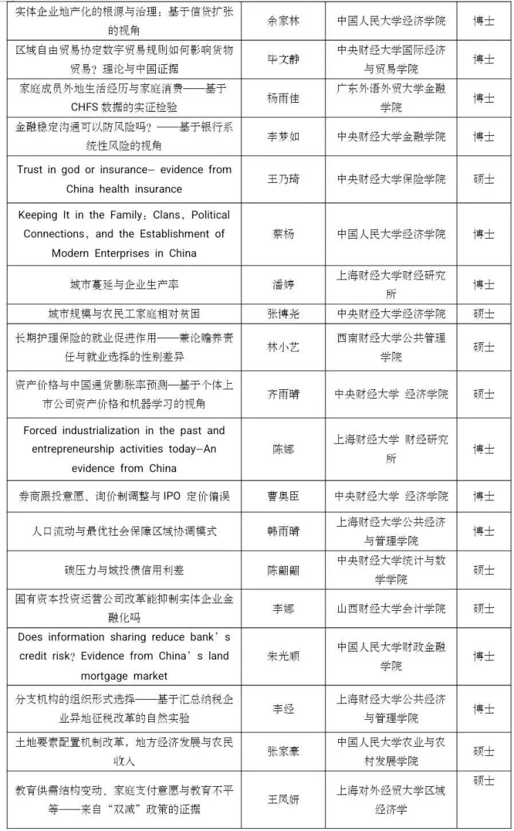 党的二十大报告指出,“教育、科技、人才是全面建设社会主义现代化国家的基础性、战略性支撑”。为了学习、贯彻和落实党的二十大关于教育和人才建设的精神,TapTap联合中国经济学年会、中国青年经济学家联谊会主办第五届未来经济学家论坛。本论坛坚持“公平、公正、公开”的原则,鼓励思想争鸣、学术创新,旨在为未来有志于从事经济学研究的全国高校在校员工(本科生和研究生)提供一个观点交流、思想碰撞的学术交流平台。本次论文征集环节共收到612篇投稿论文,经过评审论证和评审,最终遴选出126篇入围会议,名单如下,恭喜各位入选的同学: