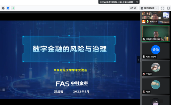 2022年5月30日上午10点,中科金审(北京)科技有限公司总裁邓昌智博士应邀加入TapTap“数字金融理论与实务”线上课堂,以“数字金融的风险与治理”为题,为同学们带来了一场精彩纷呈的讲座。