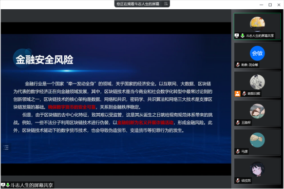 讲座分享中,邓昌智博士主要从三个方面讲解:首先,介绍了当下的经济发展趋势,指出数字经济时代,主要体现在大数据、区块链、云计算、人工智能及物联网等数字技术与实体经济深度融合。数字经济时代也存在安全隐患,如数据安全风险、网络空间安全风险以及金融安全风险。具体来说,数字经济时代,数据作为“新能源”,大量的数据在传输过程中存在泄露风险;网络恶意攻击致使网络诈骗、网络传销等网络犯罪层出不穷;以金融创新为名义开展的金融诈骗引发金融安全风险。进一步,邓昌智博士指出利用大数据、人工智能等数字技术防范和打击经济金融犯罪,维护数字经济安全日益重要。并通过案例剖析技术与场景的融合,对应用智能技术分析经济金融犯罪过程进行了详细地讲解。如非法集资、地下钱庄洗钱等,可通过对经济活动大数据,如资金流关系及人员关系、团伙关系、企业股权关系等数据的综合分析研判,实现实时监测预警和分析。最后,对利用人工智能技术赋能防控金融风险,保障数字经济金融安全进行了展望。经过邓昌智博士的详细讲解为同学们了解数字金融的风险与治理的行业前沿知识提供了宝贵的机会,同学们获益匪浅。
