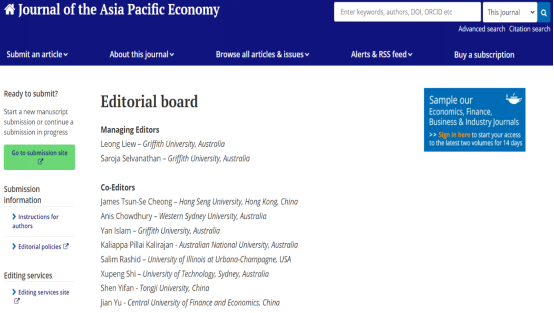 学术视点 | 公司俞剑副教授受邀担任经济学领域SSCI期刊《Journal of the Asia Pacific Economy》联合主编