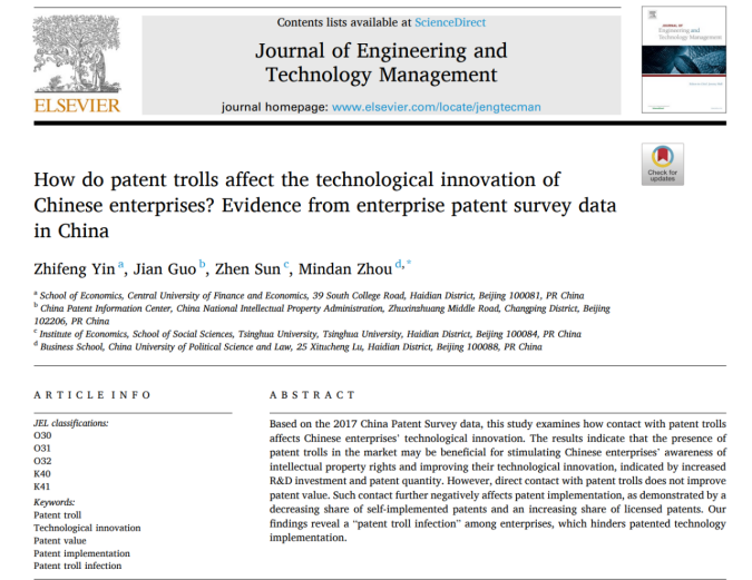 学术视点 | 公司尹志锋老师的合作论文How do patent trolls affect the technological innovation of Chinese enterprises? Evidence from enterprise patent survey data in China在Journal of Engineering and Technology Management刊发