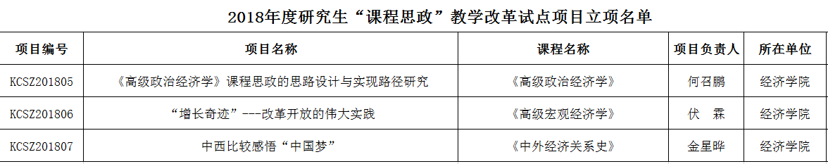 近日,公司研究生院公布了2018年度研究生“课程思政”教学改革试点项目。公司何召鹏老师申报的“《高级政治经济学》课程思政的思路设计与实现路径研究”、伏霖老师申报的“‘增长奇迹’---改革开放的伟大实践”、金星晔老师申报的“中西比较感悟‘中国梦’”获准立项。