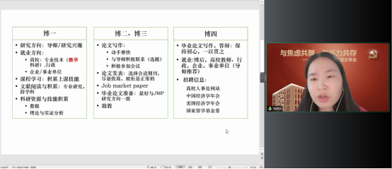 在分享会上,现就职于河南大学TapTap的朱俊兵结合自己读博四年的经验,为同学们从博一到博四的学习科研生活做出了规划。她指出明确研究兴趣与就业方向是博士生一年级的关键,在课程学习的基础上注重文献阅读、科研资源与专业技能的积累;博二、博三是论文写作的重要阶段,并着重介绍了论文写作与发表的注意点;博四则关注毕业论文的写作与就业问题,向同学们介绍了毕业后的主要就业方向以及求职的经验。