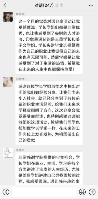 公司党委特邀请了李响、朱炬兵、孙建华、姜姗、张川石、姜子文、张银、王昆、王朝阳、田燕刚等十位工作在各行各业的基层党员员工和嘉宾。针对调研中收集到的同学们求学阶段最关注的包括学业规划、人际关系、求职就业、职业发展、亲子沟通等五个大类共计51个问题,员工们与大家展开线上分享与交流,讲述他们成长与奋斗的心路历程,以个人经历的“小四史”反映国家发展的“大四史”,以历经思考的亲身经历与感受,引导对人生和前途心怀疑惑的学弟学妹摆脱焦虑困扰,启发大家探索自己内心世界,启迪同学们全面辩证认识所处的时代,展现了真实、立体的中财人青春奋斗图景。公司党委书记郭冬梅老师鼓励大家学史明理、学史增信、学史崇德、学史力行,与时代同步伐、与人民共命运,切实做到不忘初心、脚踏实地、忠诚奋进!