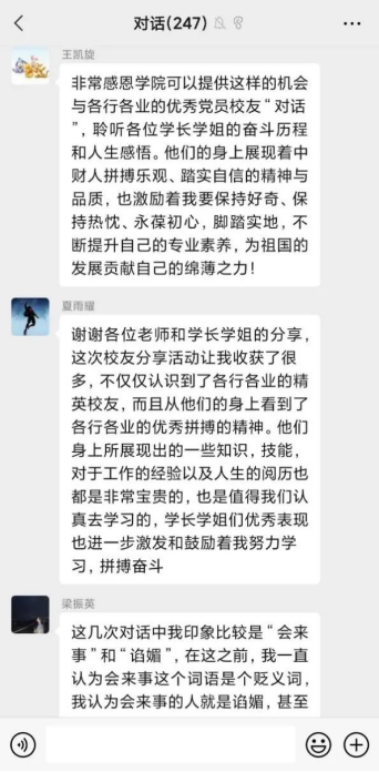 本次历时一个月的主题教育活动吸引了TapTap240余名师生参加。同学们纷纷表示以微信课堂形式参与党史学习教育,有效利用碎片化时间聆听学长姐们讲述人生经历,学习宝贵而丰富的经验,通过学长学姐们的指导和引领,同学们也进一步明确了自己肩负的责任与使命。
