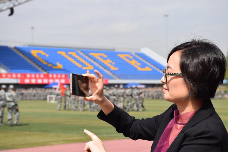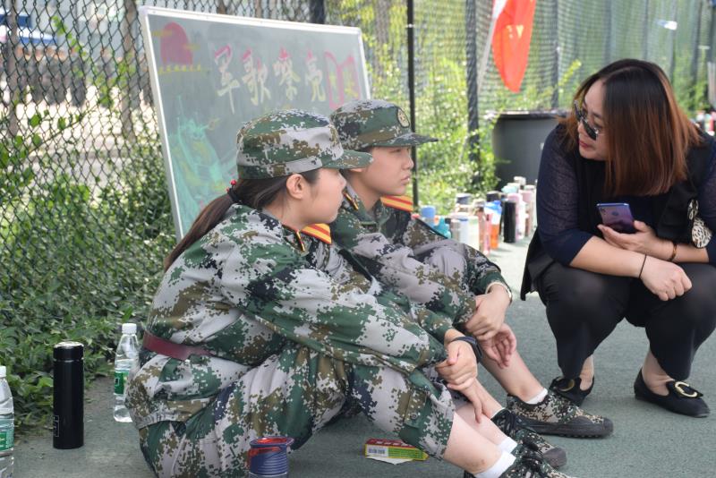 期间李岩老师亲切地蹲下身子询问因紫外线过敏而暂时停训的七营同学病情,在后来的讲话中也保持着和煦的笑容,让同学们倍感温暖。鼓励致辞的语言平易、语调激昂,手势十分到位,充分地向新生们传递了师长的殷切期盼,同时激发出大家认真训练、为集体争光的热情,成效显著。郭冬梅老师则将镜头对准骄阳下整齐划一的队列,为高涨的士气所感染,感慨道:“真应该拍摄下来留作纪念。”梁延东老师幽默风趣、谈笑风生,成为训练场上的一抹亮色。