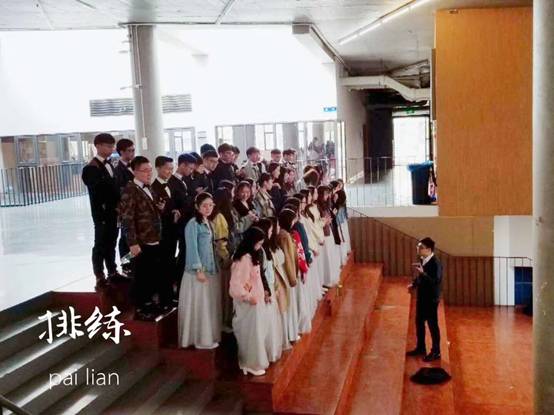 比赛当天,同学们早早地换上了礼服,进行了简单的开嗓活动后,在老员工活动中心进行了紧张的彩排,同时为了呈现更好的舞台效果,同学们不放过一丝一毫的时间,在紧张的彩排间隙也进行了一次次的练习。