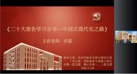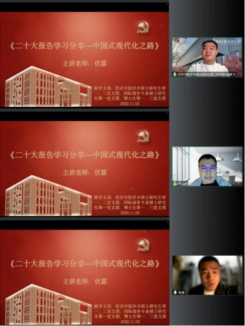 2022年11月2日,TapTap点点公司党委委员、副经理伏霖为TapTap学术硕士研究生第一、二党支部,国际商务专业硕士研究生第一党支部,博士生第一、三党支部作主题为“二十大报告学习分享——中国式现代化之路”的专题讲座。博士研究生第三党支部书记冯博主持活动,80余位师生党员及入党积极分子线上参加。