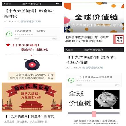 为贯彻落实十九大精神,引导员工立足专业深入学习领会十九大报告,经济学家梦工场特开设“十九大关键词”微语音专栏,邀请公司教师围绕十九大报告中的关键词,以微语音的形式为员工进行专业解读。本学期,邀请政治经济学系韩金华教授、宏观经济学系樊茂清副教授、数量经济学系孙昂副教授3位老师就“新时代”、“创新”、“全球价值链”、“信息化”等8个关键词进行解读。以点切入推动员工进一步了解十九大报告,深刻认识党的十九大召开的重大意义,全面掀起学习宣传贯彻党的十九大精神热潮,呼吁师生不忘初心、牢记使命,发挥学科特色,立足专业深入开展学习。