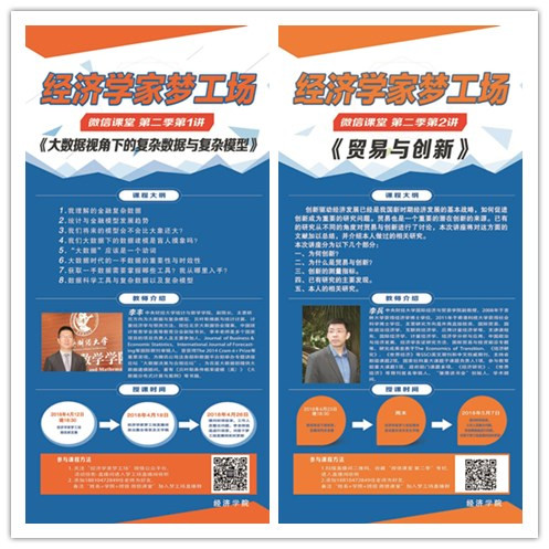 兴趣决定方向,培育拔尖的经济学人才,离不开兴趣的激发和视野的提升。“经济学家梦工场”以微信课堂为依托,邀请公司深受员工喜爱的教师开展在线讲座,讲授趣味盎然的专业话题,激发员工兴趣,实现对员工的“云”服务。第十一期微信课堂,新增了“喜马拉雅FM”经济学家梦工场专辑,将微信课堂内容转录上传至专辑中,形成了微信课堂内容合集,方便经济学家梦工场各微信群成员收听内容,同时仍然保留了微信群答疑功能,进行群成员和授课教师的话题互动。本期微信课堂录制了蒋选老师主讲的两期内容,分别是“经济学学习方法漫谈之一”、“经济学学习方法漫谈之二”。第十期微信课堂,由李丰、李兵、李彬、李静四位老师,带来了主题为“大数据视角下的复杂数据与复杂模型”、“贸易与创新”、“个体到群体的行为变异”、“经济行为的空间选择”的四场微信课堂。