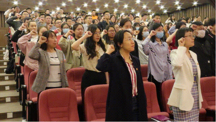 2018级硕博连读生王继彬带领全体师生重温入党誓词,誓言铿锵而有力、热血又坚定,回忆入党初心、重温入党誓词,进一步坚定了大家脚踏实地做事、担起民族复兴重任的决心和信心。