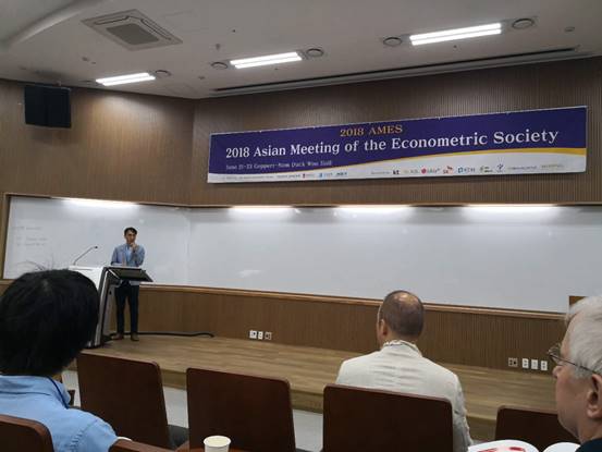 2018年6月21日至23日,美国计量经济学协会2018年亚洲年会(2018 Asian Meeting of Econometric Society)在韩国首尔西江大学(Sogang University)举行。美国计量经济学学会(Econometric Society)是促进经济理论以及计量经济学发展的国际学术组织。亚洲计量经济年会作为计量经济学学会在亚洲举办的最高层次的学术会议,覆盖从理论经济学到应用经济学研究的各个领域,其目标是促进亚洲学者和欧美学者在经济学领域的学术交流。本次会议邀请了多名享誉世界的顶尖学者,比如美国加州大学洛杉矶分校(UCLA)的JinyongHahn教授,普林斯顿大学的Mark Aguiar教授,哥伦比亚大学的Yeon Koo Che教授以及斯坦福大学的Yuliy Sannikov教授等做主题演讲或者迷你课程。
