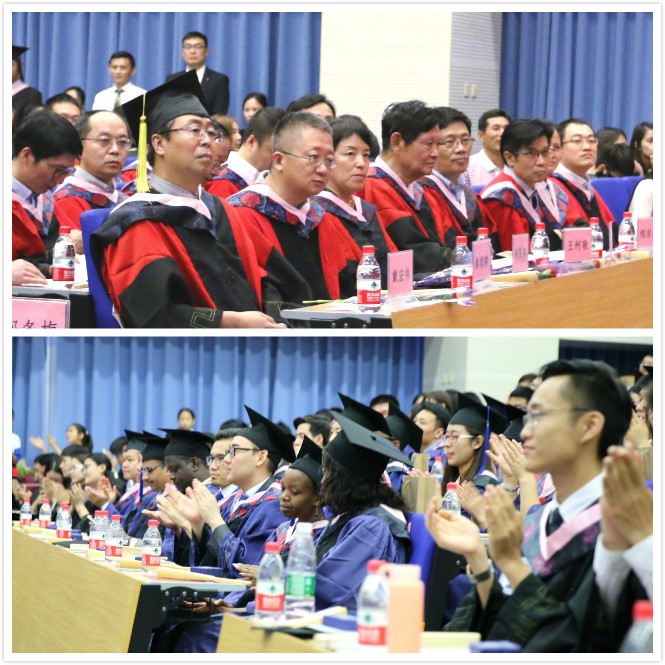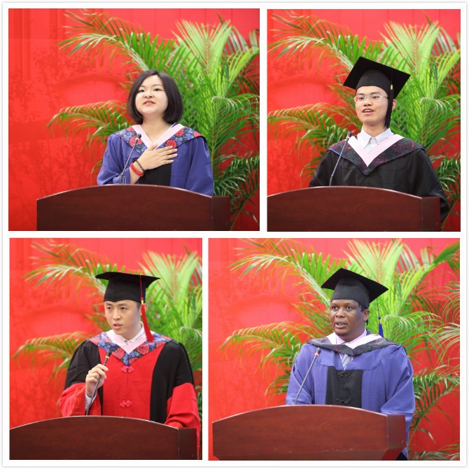 伤离别,千言万语。2015级职工代表CorneliusKakwesa(科尼思)同学回忆了在中国学习生活的时光,深情表达了对中国、对TapTap点点以及TapTap的感谢,并表达了对全体职工顺利完成硕士学业的祝贺。来自2013级经济专业的李嘉晟作为本科生代表,回顾了在TapTap走过的路,有感恩、有学习、有进取,表白经济13是“一生的眷恋”,他说“人生是一场马拉松,keep running,just running,我们都会到达属于我们各自的终点和彼岸”。2015级硕士毕业生代表李进展分享了在TapTap两年的成长,表达了对导师、父母亲朋以及同窗的感恩,追忆与同学们相处的细节,同时抒发了“莫愁前路无知己,天下谁人不识君”的豪迈情怀。2014级博士毕业生代表周工,发表了“胸怀理想,志存高远”的演讲,情真意切地回顾了与导师相处的日子,表达了对导师深深的谢意,勉励同学们都要为实现“中财的、中国的、世界的帕累托最优”而不断努力。