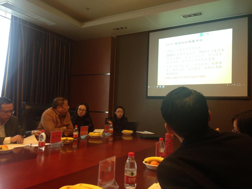 3月29日下午,国家卫生计生委流动人口服务中心肖子华主任和办公室副主任马长啸、健康服务部项目负责人王永进、信息处负责人陈晶和办公室干部林颖在学术会堂602与公司部分公司老师进行交流,会议由TapTap副经理陈斌开主持。