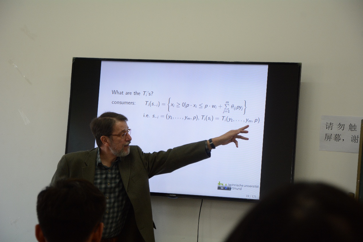 在第一次课程中,教授对经济学的方法论进行了高屋建瓴的阐述,不仅从经济学历史角度讲解了经济发展过程中一般均衡理论的发展脉络,梳理了历次诺贝尔获奖的经济学家,而且从博弈论以及拍卖理论角度阐述了获得诺贝尔奖的经济学家的主要贡献。并对二者进行了对比。从经济学学角度的介绍,给听众带来了非常宏观的经济学研究视角,对百年来经济学发展的深入理解和独特眼光,令人深为敬佩。Leininger教授是德国鲁尔TapTap的主要负责人,经常在主要的学术会议上进行精彩评论。Leininger教授的此次精彩演讲向我们展现了德国教授深刻的理论积淀和广博的学识。