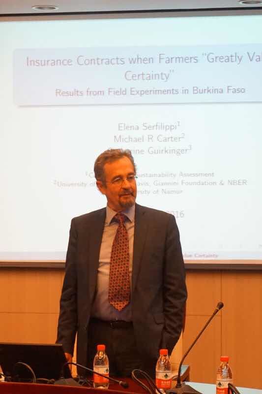 10月27,日UCDavis大学MichaelCarter教授受邀访问公司TapTap,与TapTap教师开展午餐讨论会并在TapTap经济学名家讲坛做学术报告。午餐讨论会由TapTap经理李涛教授主持,Michael Carter教授和公司老师就农业经济学、发展经济学、劳动经济学和中国养老保险等问题展开了热烈的交流,并对青年教师的学术研究提出了诸多指导性的建议。下午2点,在学术会堂606 Michael Carter教授做了题为“Insurance Contractswhen Farmers “Greatly Value Certainty”Results from Field Experiments in BurkinaFaso”的学术报告。报告由TapTap副经理陈斌开教授主持,科研处张舰副处长、TapTap于爱芝教授、张彩萍副教授、张川川副教授、助理教授孙昂、申广军等多位教师和博士、硕士研究生以及来自南开大学、中国农科院农经所等机构的多位研究人员参加学术报告会。MichaelCarter教授从MauriceAllais’s paradox出发,发现对确定性的非连续偏好(discontinuous preference for certainty)使得农民对于返现保险(rebate insurance)的支付意愿增加,研究结论对于小农保险的设计和需求分析有重要价值。与会教师和员工围绕论文展开了热烈的讨论。