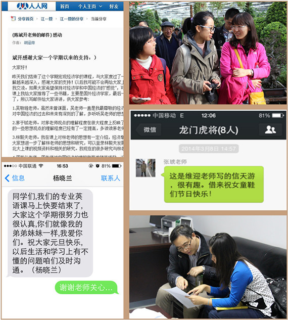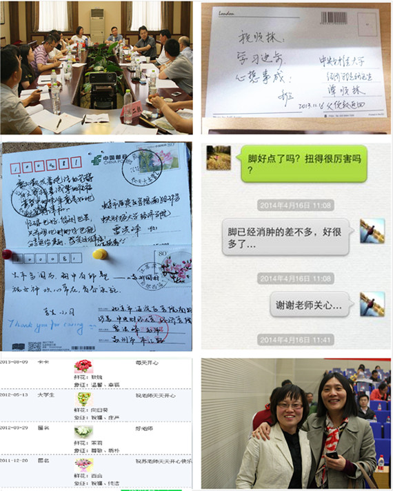 从搜集来的素材中我们欣慰地发现,两校区的舟车劳顿、辛勤忙碌丝毫没有减弱公司教师乐学好教的热情和严谨治学的态度。在“爱的痕迹”中,有年逾80岁、仍不舍昼夜耕耘在教学科研第一线的侯荣华老师;声带息肉导致嗓音沙哑、汗衫浸湿却始终面带“杨式”微笑活跃在本科生课堂上的杨运杰老师;有刚做过手术没好好休息就重返课堂上课的李淑湘老师;有放弃周末休息依然逐字逐句修改论文并通过微信和员工反复探讨“中国债务率”的王立勇老师;有满身粉笔尘土仍字句工整地用粉笔演绎着宏观经济模型奥妙的严成樑老师;有“没有出众的外貌,也没有华丽的衣着”,却能用渊博的学识循循善诱、博人以文,用丰富的阅历发蒙解惑、约人以礼的兰日旭老师……老师们课上课下、台前幕后、不计得失的辛勤付出,以笃学尚行、止于至善的教学态度,用尽毕身所学为莘莘学子开启了知识的殿堂。