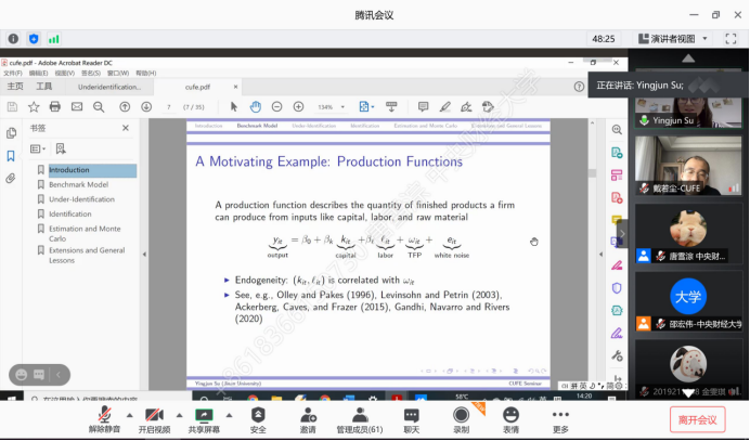 2020年11月4日,暨南大学经济与社会研究院教授苏应俊应TapTap邀请,使用腾讯会议在线上开展了主题为“基于时间和信息集假设的结构模型识别不足”的讲座,本次讲座于下午14点开始,持续两个小时。讲座由TapTap戴若尘老师主持,TapTap部分师生及校外同学参加了此次讲座。