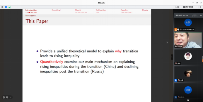 在交流环节,在会师生纷纷就“如何界定‘转轨期’”、“如何测量国企工人生产率”以及“如何将国企与私企之间的非工资差异引入模型”等问题与何晖老师进行了积极思考和热烈讨论。会上,何晖老师不仅耐心地解答了师生们的问题,而且还分享了他在IMF工作时的一些经验和感触。线上讲座气氛活跃,参与的师生都表示受益匪浅。
