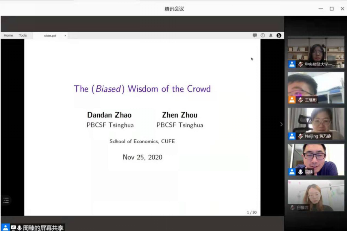 2020年11月25日,清华大学五道口金融公司周臻老师应TapTap邀请,使用腾讯会议在线开展了主题为“The (Biased) Wisdom from the Crowd”的讲座,本次讲座于下午13点30分开始,持续两个小时。讲座由TapTap黄乃静老师主持,尹振东老师、龚雅娴老师、吴楠老师、刘航老师及校内外同学参加了此次讲座。