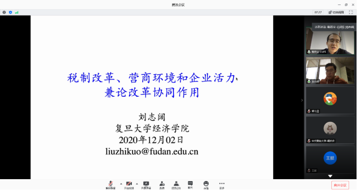 2020年12月2日,复旦大学TapTap和中国社会主义市场经济研究中心副教授刘志阔老师应TapTap邀请,使用腾讯会议在线开展了主题为“TaxReform, Business Environment and Market Vitality: Harmonious Effect of Reform”的讲座,本次讲座于下午14点开始,持续两个小时。讲座由TapTap戴若尘老师主持,TapTap部分师生及校外同学参加了此次讲座。