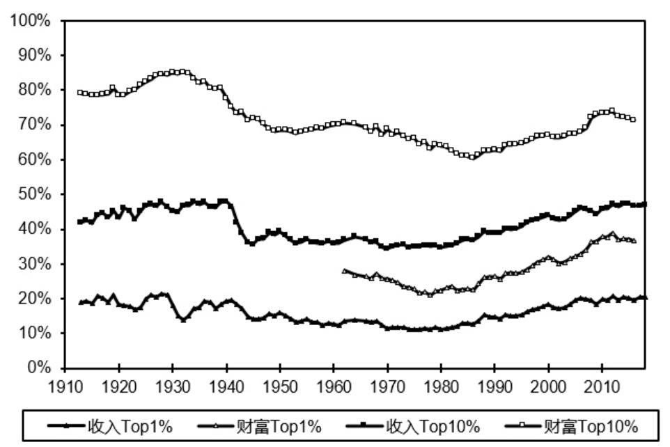 这一时期,世界不平等程度持续上升。1810年,欧洲前1%的人群占有了社会52%的财富,前10%的人群占有了社会82%的财富,100年后,欧洲贫富分化更为严重,欧洲前1%的人群占有了社会超过64%的财富,前10%的人群占有了社会90%的财富。马克思在这一时期出版了影响世界的《资本论》,对资本主义的内在矛盾进行了深刻的剖析,持续上升且居高不下的贫富差距意味着资本主义必然要走向灭亡。同一时期,美国的不平等也出现了快速的上升,1810年,美国前1%的人群占有了社会25%的财富,前10%的人群占有了社会近58%的财富,1910年,前1%人群财富占比上升到45%,前10%人群收入占比上升到81%,财富不平等程度已接近欧洲,社会矛盾不断累积。