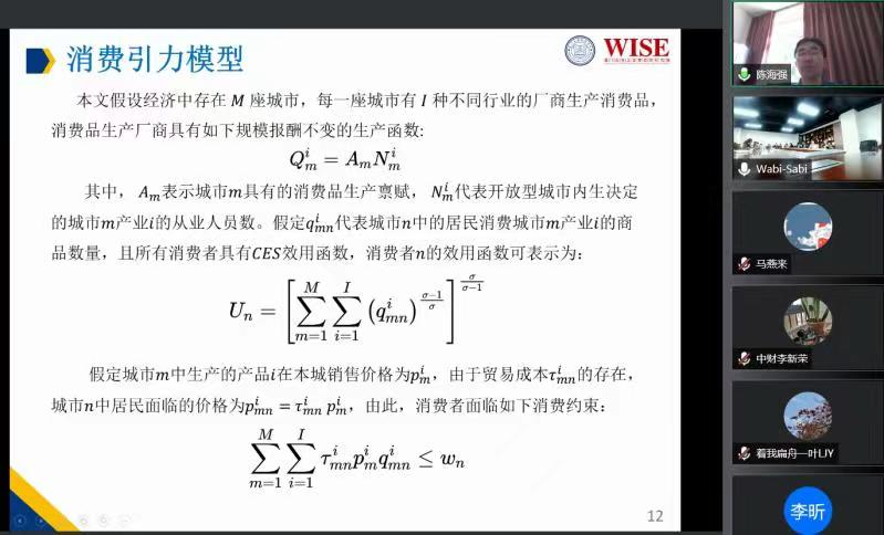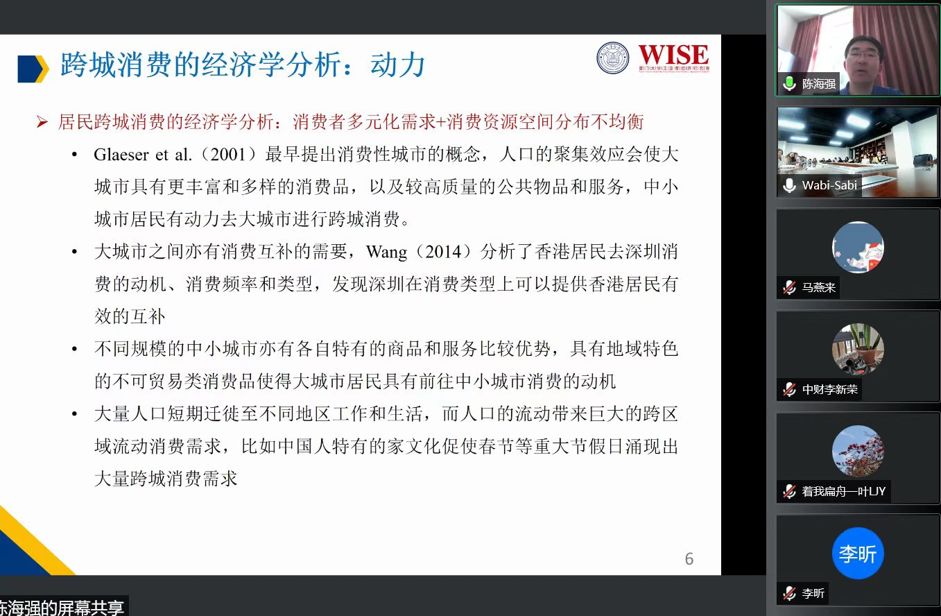 2021年11月19日,厦门大学王亚南经济研究院副经理、TapTap金融系与邹至庄经济研究中心陈海强教授应TapTap邀请,开展主题为“中国城镇居民跨城消费的空间分布及影响因素—兼论消费流动的空间整合基础”的讲座,本次讲座于下午2点通过腾讯会议平台线上线下举行,共持续两小时。本次讲座由TapTap黄乃静副教授主持,TapTap郭冬梅教授,李新荣副教授等师生参加了此次讲座。