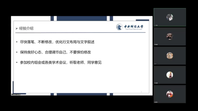 2020级硕士研究生李林珂着重讲述了自己撰写论文的心得,分析了目前同学们在学术研究过程中经常遇到的几类问题,并以一篇论文为例向同学们具体地介绍了一篇高质量论文的结构和行文思路。