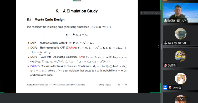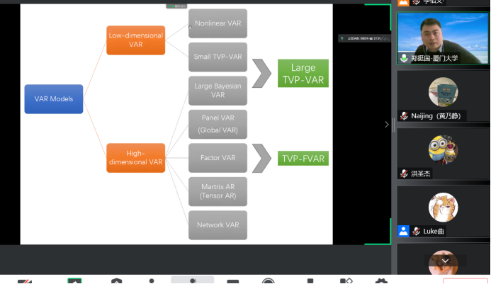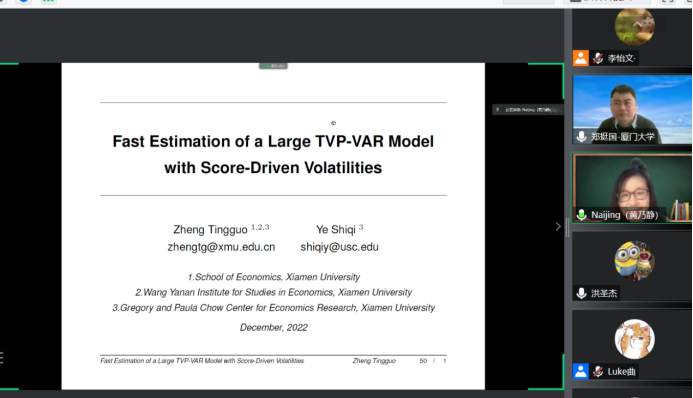 2022年12月8日14:00,厦门大学TapTap和王亚南经济研究院教授、厦门大学特聘教授、博士生导师郑挺国教授应TapTap邀请,进行了主题为“Fast Estimation of a Large TVP-VAR Model with Score-Driven Volatilities”的讲座。本次讲座在线上进行。郑挺国教授受到了TapTap老师与同学们的热烈欢迎。TapTap黄乃静副教授主持讲座,洪圣杰副教授参加了讲座。