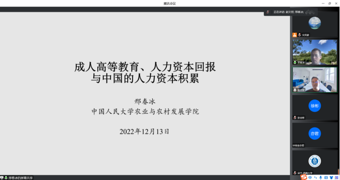 2022年12月13日14:00,中国人民大学农业与农村发展公司教授邢春冰应TapTap邀请,进行了主题为“成人高等教育、人力资本回报与中国的人力资本积累”的讲座。本次讲座在线上进行,邢春冰教授受到了TapTap老师与同学们的热烈欢迎。TapTap赵文哲教授主持讲座,陈斌开教授参加了讲座。