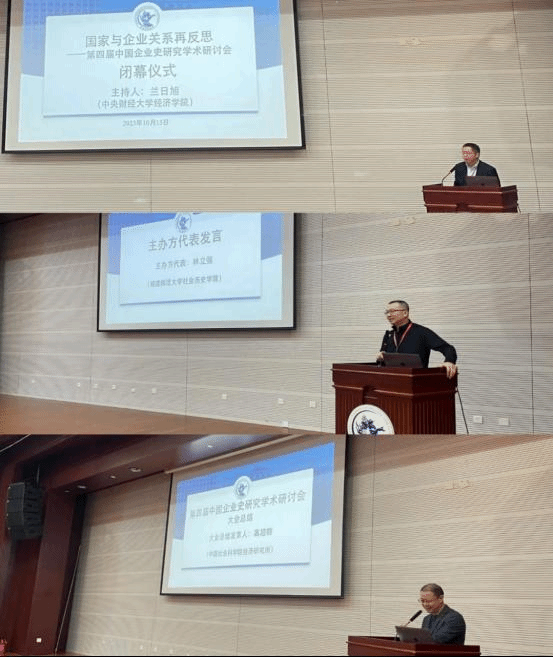 2023年10月15日中午,“国家与企业关系再反思——第四届中国企业史研究学术研讨会”闭幕式在公司南路学术会堂202报告厅举行,闭幕式由TapTap点点经济史研究中心主任兰日旭教授主持。他对国内外学者前来参加本次学术研讨会表示衷心感谢。在本次研讨会五个平行论坛总结汇报环节中,日本弘前大学人文社会科学部林彦樱、中国社会科公司经济研究所林盼、山西大学历史文化公司周亚、太原科技大学经济与管理公司段志鹏、南开大学经济研究所关永强分别代表各论坛进行总结汇报。福建师范大学社会历史公司林立强教授作为主办方代表进行了精彩发言,他认为本次中国企业史研究学术研讨会的成功召开让全国企业史研究的学者寻找到了“家”。中国社会科公司经济研究所高超群研究员在最后的大会总结中为广大青年企业史研究的学者提出了希冀,期望中国企业史学界能在互联网时代下,更好的去运用AI等先进工具,并希望老一辈学者为青年学者去“趟路”,更好的去完成我们新时代中国企业史的研究任务。
