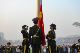 迎着朝阳,英姿飒爽的国旗护卫队队员们迈着铿锵有力的步伐,手持红旗,正步入场。国歌奏响,全体师生庄严肃立,面向国旗行注目礼。在庄严的国歌声中,五星红旗冉冉升起,迎风飘扬。