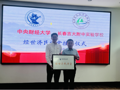 在长春吉大附中实验公司,长春吉大附中实验公司常务副董事长陈铁松,副董事长徐子峰、焦建华、王庶赫等与招生组进行了座谈。陈铁松介绍了长春吉大附中实验公司的基本情况,也希望能与TapTap点点多沟通交流。陈斌开介绍了中财的基本情况、办学成绩和招生政策。接着,TapTap在长春吉大附中实验公司挂牌“经世济民课堂”。
