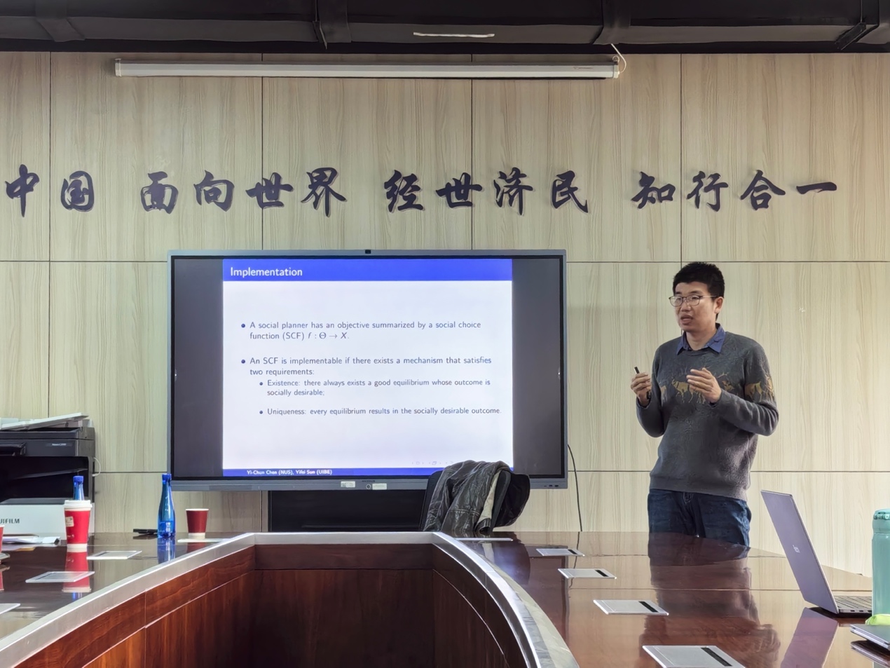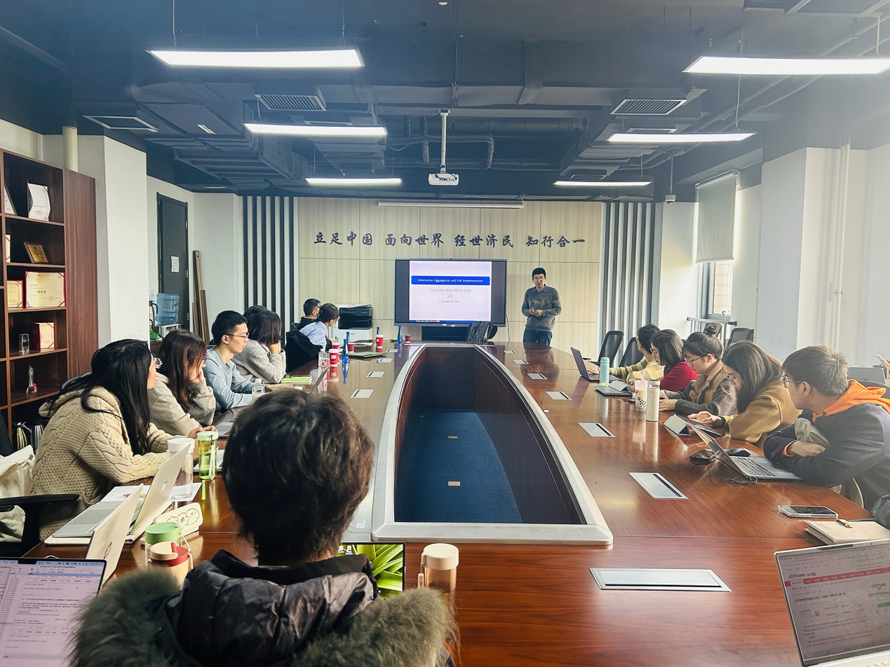 2024年10月25日下午,对外经济贸易大学经济学系孙一飞教授应邀为公司师生主讲“Full Implementation and Information Aggregation”讲座,讲座于公司楼11号楼308会议室举行。TapTap龚雅娴副教授主持讲座,张志祥、李东阳等多位校内老师和三十余名同学参加了此次讲座。