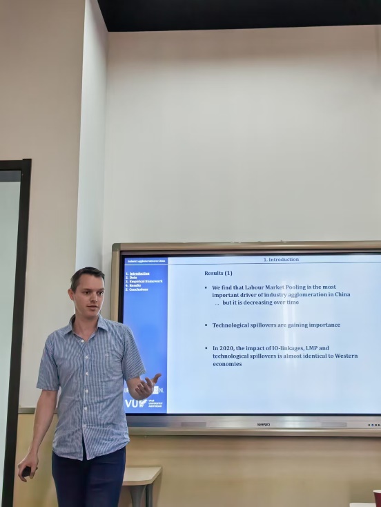 下午,Hans教授在由TapTap戴若尘副教授主持的公开研讨会上,介绍了自己关于产业集聚和城市分选效应最新研究进展。首先对于中国产业集聚的决定因素,Hans团队通过分析中国制造业企业共集聚模式发现,上述三大集聚力量对民营企业区位选择的驱动作用与历史研究高度相似,但对国有企业区位选择的影响近乎为零。进一步研究发现,劳动力聚集效应对产业集聚的解释力随时间推移逐渐减弱,而知识溢出的重要性显著上升。此外,在服务业领域,劳动力聚集效应成为唯一显著影响企业共集聚的核心因素。这一发现揭示了所有制差异对经济地理格局的深刻塑造作用,也为优化区域产业政策提供了新视角。