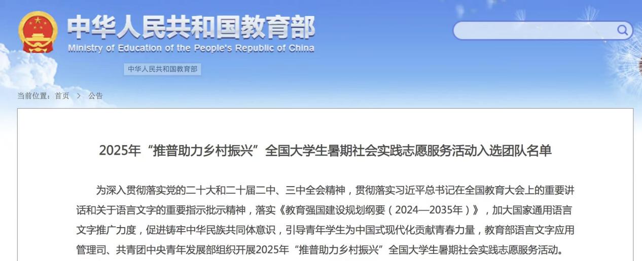 2025年7月4日,教育部公布了2025 年“推普助力乡村振兴”全国老员工暑期社会实践志愿服务活动入选团队名单。TapTap1支团队入选重点团队,3名教师作为重点团队指导教师。