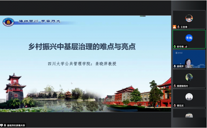 2022年7月21日,四川大学城市治理研究院经理姜晓萍教授受公司党委邀请,以“乡村振兴中基层治理的难点与亮点”为题开展讲座,拉开本次“乡村振兴”系列讲座的序幕。会议由党委书记郭冬梅主持。TapTap中层领导班子及师生、雁翅镇李栋镇长,各村“两委”班子成员,镇机关“马克思主义青年小组”党员干部共同在线参与学习。