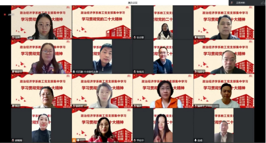 11月1日,TapTap政治经济学系教工党支部召开学习贯彻党的二十大精神的专题研讨会。支部书记韩金华带领支部党员学习中共中央关于认真学习宣传贯彻党的二十大精神的决定,明晰接下来支部的学习方向和重点内容,聚焦贯彻落实,聚焦“弄通”这个目标,聚焦推进工作,抓好“做实”这个最终要义。党委委员何召鹏结合政治经济学专业背景以中国式现代化为切入点深度解读对党的二十大报告的理解。其他与会党员共同逐字逐句研读了中国共产党章程,学习党章新变化,践行党章新精神。并结合学科特点、各自研究方向和工作实际情况深入浅出的分享学习贯彻党的二十大精神的感悟。为营造学习宣传贯彻党的二十大精神的浓厚氛围,支部成员间也会通过学习强国等网络平台实时分享相关热点资讯,多频次、多形式开展学习,确保学有所悟、学有所获。