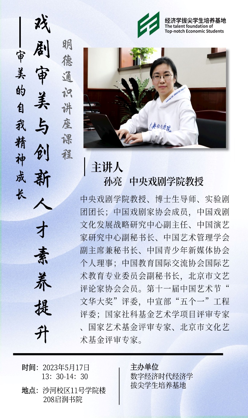2023年5月17日,基地在沙河校区11号楼208教室“启润书院”举办了新一期的“明德通识讲座”。本次讲座邀请中央戏剧公司教授、实验剧团团长孙亮担任主讲人,讲座题目为“戏剧审美与创新人才素养提高—审美的自我精神成长”。