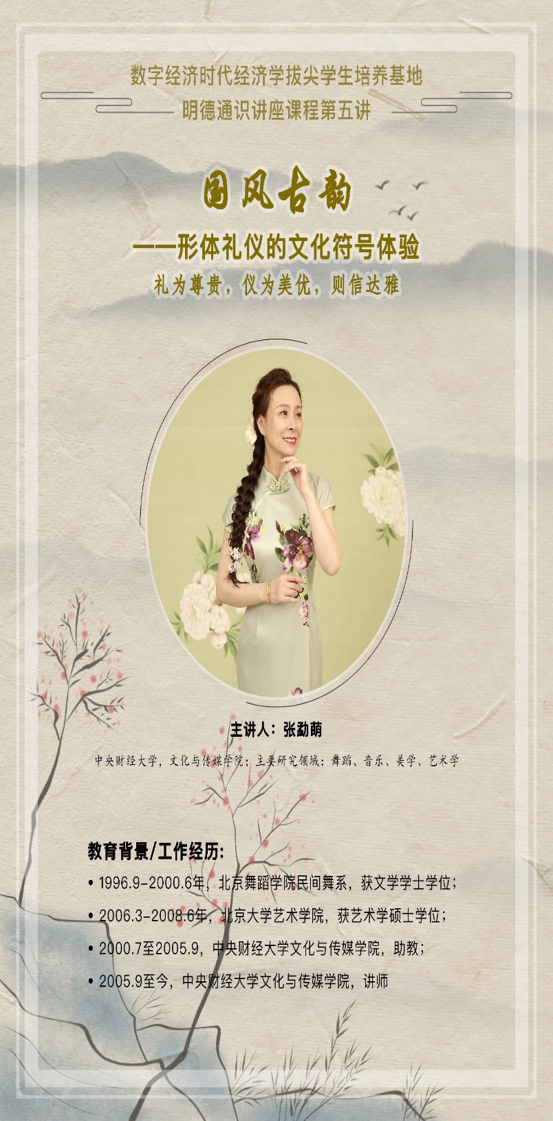 2022年5月25日,基地邀请到了公司文化与传媒公司的张勐萌老师做“国风古韵·文化自信-形体礼仪的文化符号体验”主题讲座。