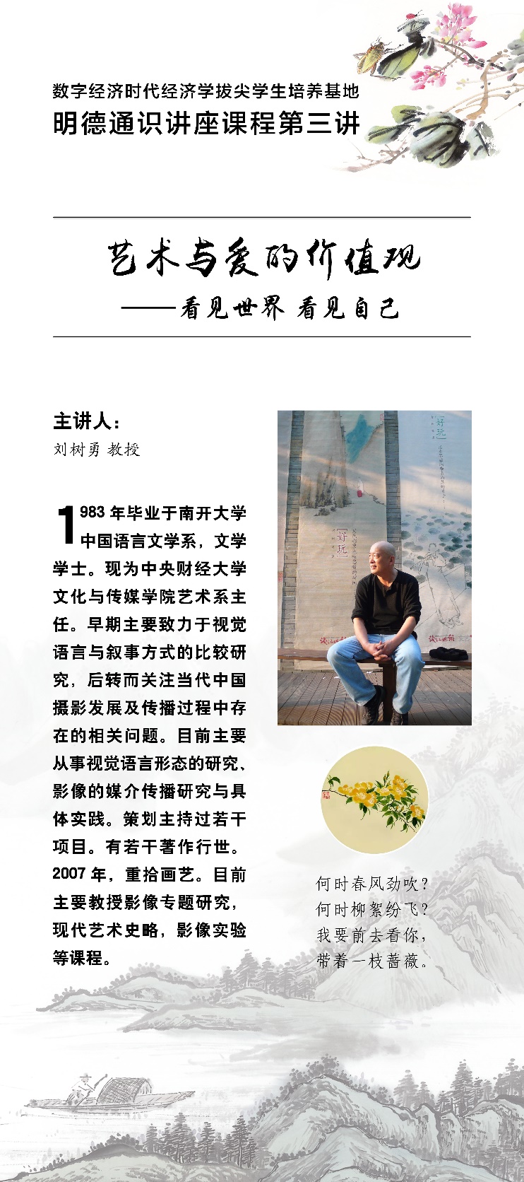 2021年11月24日下午,基地邀请到公司文化与传媒公司艺术系主任刘树勇教授做“艺术与爱的价值观——看见世界,看见自己”主题讲座。