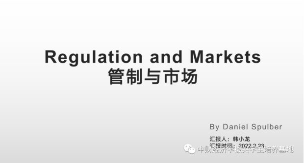 最后,韩小龙同学分享了丹尼尔·F·史普博攥写的《管制与市场》。作者丹尼尔·F·史普博是美国西北大学凯洛格管理公司杰出教授和战略教授,在反垄断、平台与双边市场、知识产权、技术与创新、产业组织等领域拥有丰富的研究成果。在书中,作者回顾了关于管制的经济学、法学和政治科学的定义,提出了关于管制的新经济学定义,为管制的研究建立了一个前后一致的框架。接着,作者研究了可竞争市场,目的是分解规模报酬递增对市场均衡价格和产量的影响效果,从而考察由规模经济造成的市场失灵的范围和程度,并由此提出四种定价方式。另外,作者还研究了公共事业费率的管制,最后总结提出管制的动态性实质,并指出了制定管制政策过程中需要重视的问题。《管制与市场》一书是管制经济学领域的杰出作品,理论体系完备,论证脉络清晰,其“内部性”概念的提出也极具洞见和原创性,是相关领域不可多得的杰作。