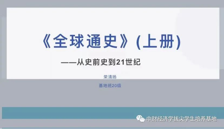 接着,荣清扬同学带来了他对《全球通史》这本书的思考与感悟。《全球通史》由斯塔夫里阿诺斯著,吴象婴、梁赤民、董书慧、王昶译,作者在本书中采用全新的史学观点和方法,将整个世界看作一个不可分割的有机统一体。从全球的角度而不是从某一国家或某一地区的角度来考察世界各地区人类文明的产生和发展,把研究重点放在对人类历史进程有重大影响的历史运动、历史事件和它们之间的相互关联和相互影响上,努力反映局部与整体的对抗以及它们之间的相互作用。本书一经问世,受到著名历史学家汤因比和巴勒棵拉夫的高度评价,立即被译成多种文字,流传甚广,影响很大。该书不是一味地把读者拉向遥远的过去,而是随时把历史上的重大变故与当今世界的现状联系在一起,它提醒读者认清所生活的现实世界与历史的内在联系,阅读此书,可以从整体的角度了解全球历史的变迁、发展与兴衰,使我获得了从整体上了解事物的敏锐度,能够从整体和部分两个层面分析生活中的事件,锻炼了我的理解能力与耐心。