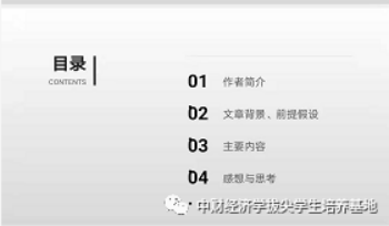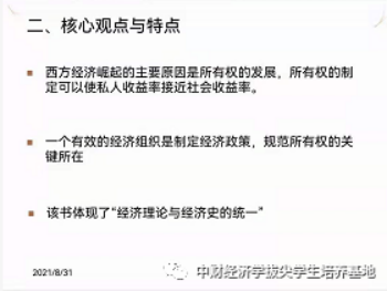 荣清扬同学为我们汇报了《西方世界的兴起》,此书是著名经济史学家道格拉诺斯在2009年发表的一部新经济史学著作。在书中,作者以新的角度,用交易成本、所有权等理论解释了西方世界经济增长的原因。这本书共分为三部分,第一部分是简介,作者在这里提出了全书的核心观点,即有效率的经济组织是经济增长的关键,西欧经济增长的原因亦是如此。在第二和第三部分中,作者以西方民主国家建立先后进行分段,分析了从公元十世纪至十七世纪的经济史,对上述的观点进行了论述。斯诺作为新经济史的先驱者和开拓者,创造性地运用新古典经济学和计量经济学来解决问题,建立了集政治制度、经济形态、文化环境、法律制度等相结合的理论体系,对经济史学的发展起到了重要作用。在阅读本书时,应先对基础史实拥有基本了解,这对理解作者的思想,方便阅读有很大帮助。