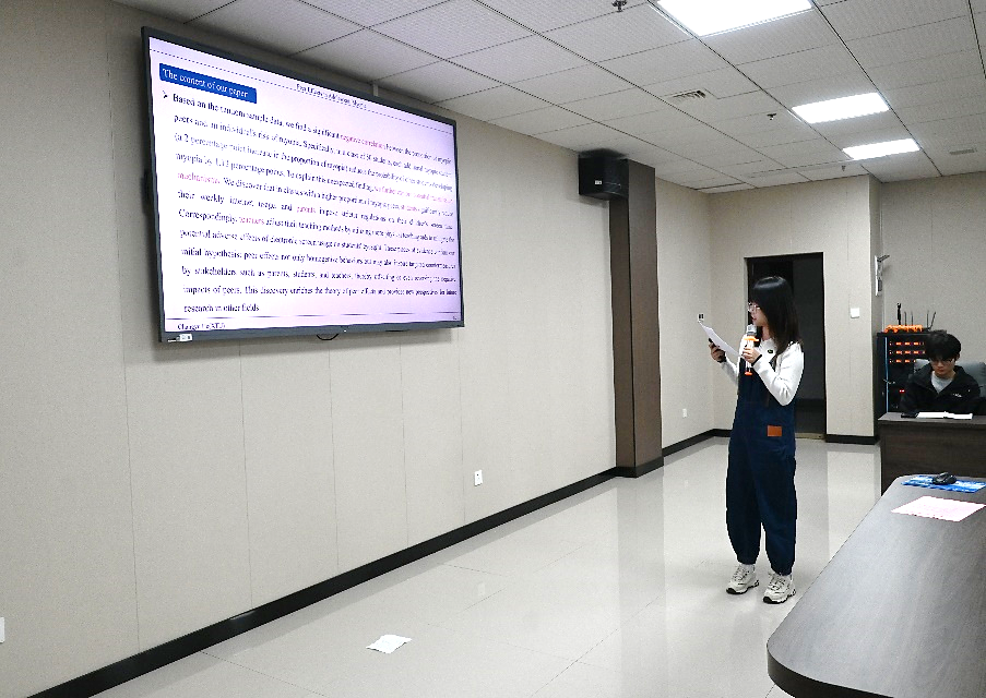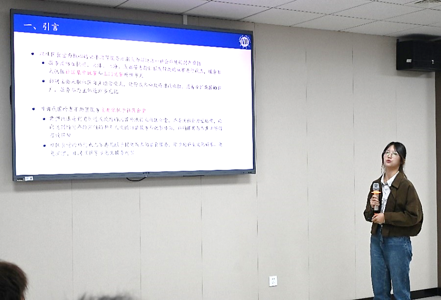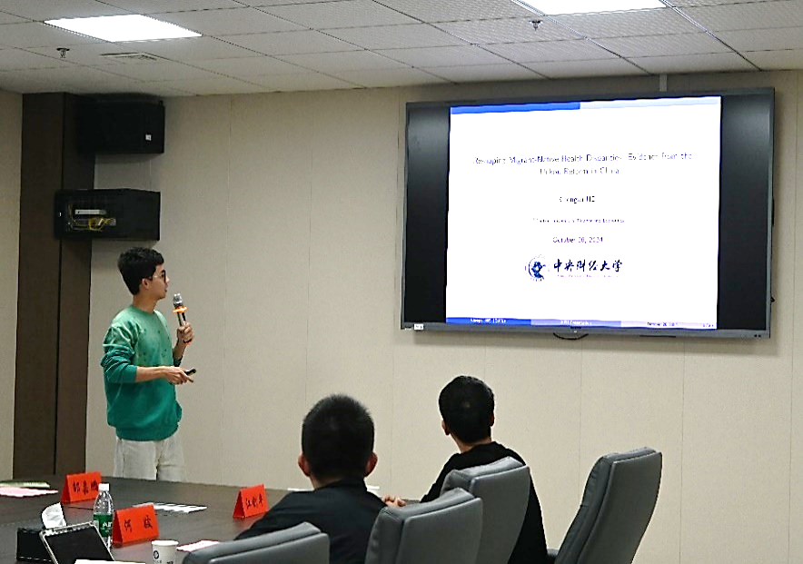 湘潭大学商公司经济学类(韶峰班)员工代表刘尧、贺嫦宇汇报了各自的工作论文。刘尧同学探究了社区食堂建设对老年人健康水平以及消费水平的影响,研究发现建设社区食堂对二者有显著的促进作用;贺嫦宇同学研究了同侪效应在班级近视率中的表现,是健康经济学领域较为新颖的探索。随后,梁银鹤老师分别就引言立意、选题创新性、文献贡献、识别策略为两篇文章提出了建设性意见。与会同学也就选题背景与回归结果的经济含义进行了充分讨论。