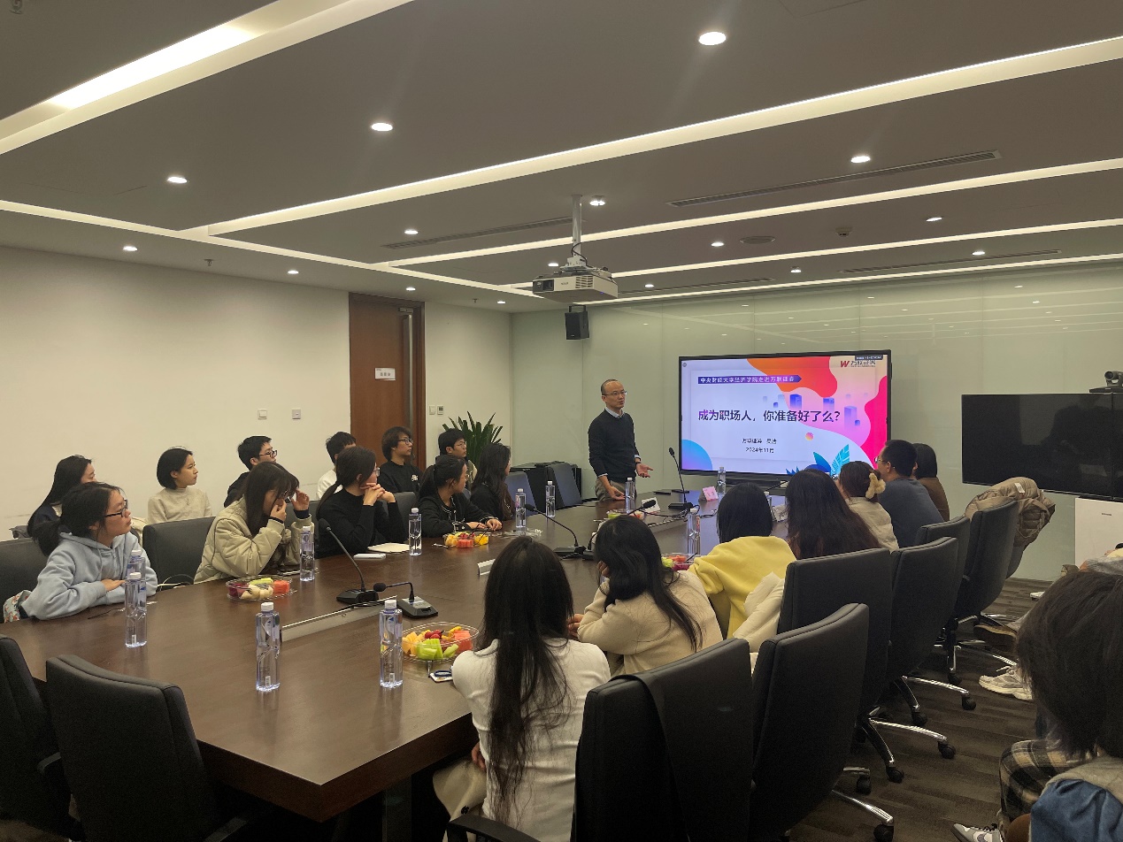 万联证券北京分公司总经理吴浩带领大家有序参观办公区域,深入了解了万联证券的办公条件、业务状况等内容。随后在座谈会上,总经理吴浩对老师和同学们的到来表示热烈欢迎,他以中国金融体系结构引入,详细介绍了证券公司的特点及其在金融体系中的地位。此外,他还就老员工就业方向进行了深入分析,强调老员工一定要找清楚自己的定位,主动了解公司的组织架构,同时还应时刻关注国家的经济金融政策。